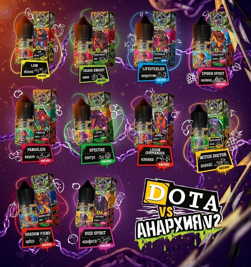 Жидкость Dota & Анархия V2 30 мл 20 мг hard Вкусы: Lion - кислое яблоко Chaos knight - кислое киви Lifestealer - кислый энергетик Ember spirit - кислая малина Witch doctor - кислый ананас Legion commander - кислая клюква Spectre - кислый кактус Pan...
