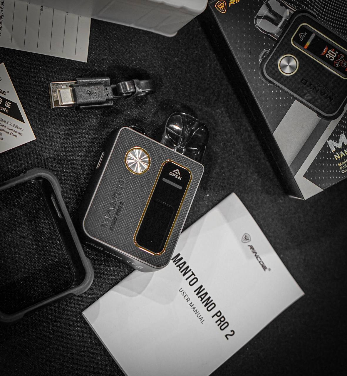 Rincoe Manto Nano Pro 2 - это стильный и компактный вейп, который идеально подходит как для начинающих, так и для опытных пользователей. Металлический корпус прикрыт по бокам накладками с разными текстурированными материалами и дополнительно защищён по периметру резиновым бампером с карбоновыми вставками. Экран и кнопка управления расположились на одной стороне, при том, что нажимать на кнопку удобно, так что ею можно смело пользоваться во время парения, а не только управлять настройками. Естественно, можно парить и просто делая затяжки, плата это позволяет.