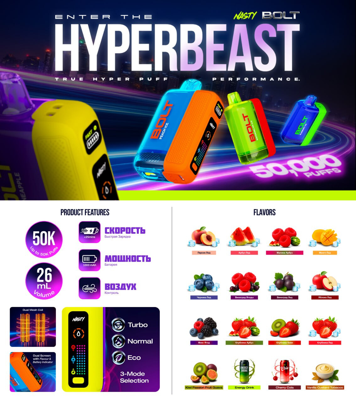 NASTY BOLT 50000 затяжек — одноразовый вейп с мощным вкусом и длительным сроком работы